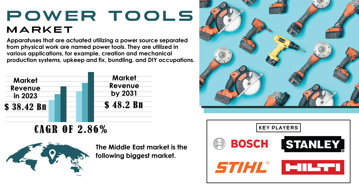 TEXES, AUSTIN, UNITED STATES, May 13, 2024 /EINPresswire.com/ -- The power tools market is expected to reach USD 48.2 billion by 2031, due to the increasing demand for power tools in various industries, particularly construction, manufacturing, and automotive, where efficiency, precision, and safety.Download Sample Copy of Report: https://www.snsinsider.com/sample-request/1107