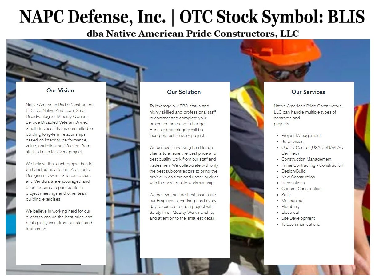 On March 27th BLIS announced it successfully concluded its due diligence and signed a Definitive Agreement for merger and acquisition with Native American Pride Constructors, LLC (“NAPC”) of Largo, FL.