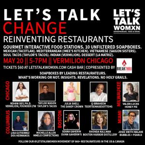 Open to the public, this is a dynamic, gourmet evening for all who love dining out and for restaurateurs to introspect on building better restaurants. Feast on six interactive gourmet global food stations by LTW Chicago restaurants. Hear from ten LTW restaurateurs in an unfiltered four-minute soapbox. What's working with restaurants today? What's not? These are hands-on owner-operator opinions, insights, and revelations across innovation, food trends, immigration, local and sustainable offerings, wages, tipping, herd hypes and fads, fine dining norms, ethnic or global fare, pricing, automation, charity causes, economics, policy, elitism, and more. Tickets are $60 with a cash bar at LetsTalkWomxn.com.