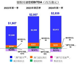 于2024年第一季度,「澳門銀河™」博彩业务因净赢率偏高,令经调整EBITDA增加约4,800万元,净赢率正常化后第一季度经调整EBITDA为26亿元,按年上升44%,按季下跌4%。