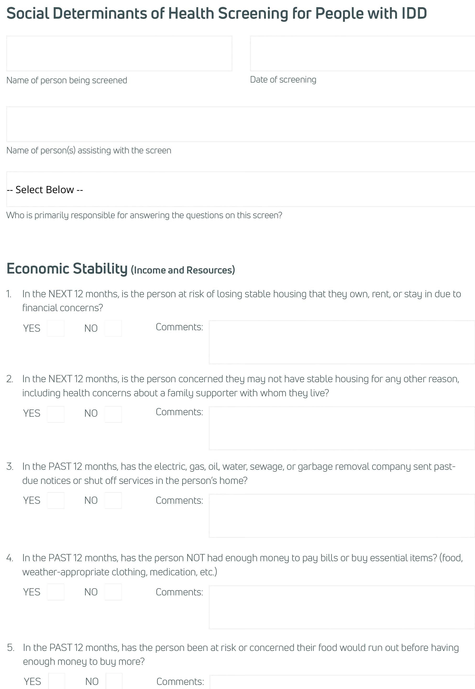 Utilizing Healthy People 2030’s five domains of SDOH as the framework, questions are designed to address specific areas in each domain. The questions are intended to be answered by the supporters of the person with IDD and the person being screened to the maximum extent possible. Any question with an answer of “yes” will indicate an area that needs further evaluation.