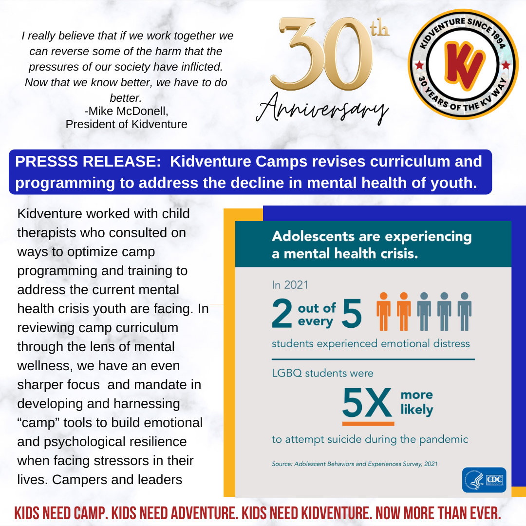 Kidventure Camps celebrates its 30th anniversary year with enhanced intentionality in its curricular and programming to promote mental wellness of youth.