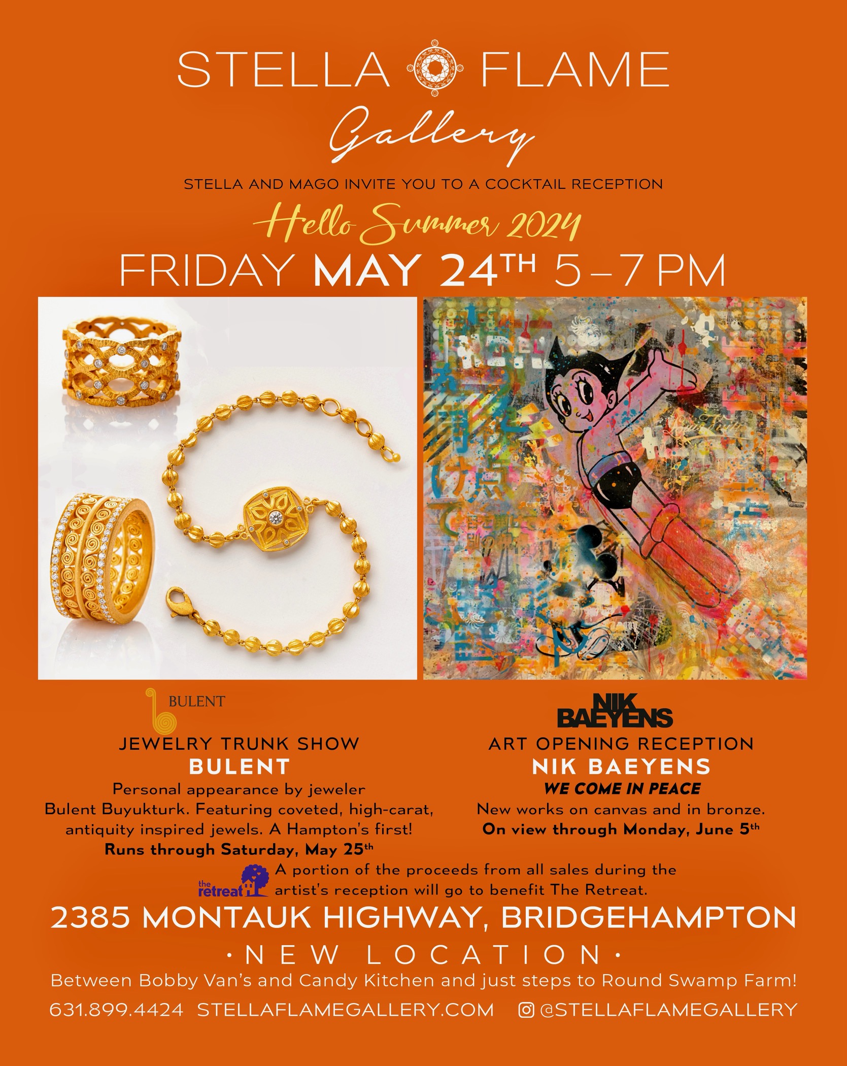 Stella Flame Gallery kicks off the Summer 2024 season with world renowned jeweler Bulent's 24K gold jewelry and Belgium's Nik Baeyen's heartening new works.