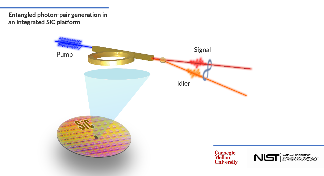 In a new paper (https://doi.org/10.1038/s41377-024-01443-z) published in Light: Science & Applications, scientists at the National Institute of Standards and Technology (NIST) in Gaithersburg, MD and at the Carnegie Mellon University of Pittsburg, PA have reported the first demonstration of a chip-scale entangled photon source in SiC. The device is implemented by a high-order non-linear process known as spontaneous four-wave mixing (SFWM) using an integrated optical microring resonator patterned onto a 4H-SiC-on-insulator platform.