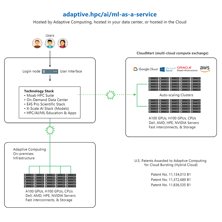 Adaptive Computing offers a comprehensive HPC/AI/ML as a Service solution tailored to meet the diverse needs of enterprises embarking on their AI journey. By providing a turnkey solution, Adaptive Computing simplifies the often-complex process of implementing AI technologies, making them accessible to organizations of all sizes and at various stages of AI adoption.
