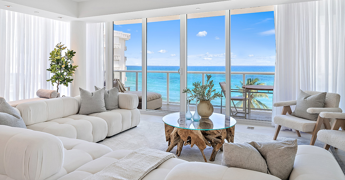 3550 South Ocean Boulevard, 5B features chiseled limestone, white oak, and walnut that warm the space, plus floor-to-ceiling windows with an unmatched ocean view. The primary suite has a large, modern ensuite bathroom, with a lavish bathtub and shower. There is also a spacious dressing room and a private balcony overlooking the clear blue water. The kitchen is a custom-designed Molteni kitchen by DDG and Champalimaud and is a chef’s paradise. The spacious living area is perfect for entertaining and with two additional bedrooms and full bathrooms, there is abundant room for guests.