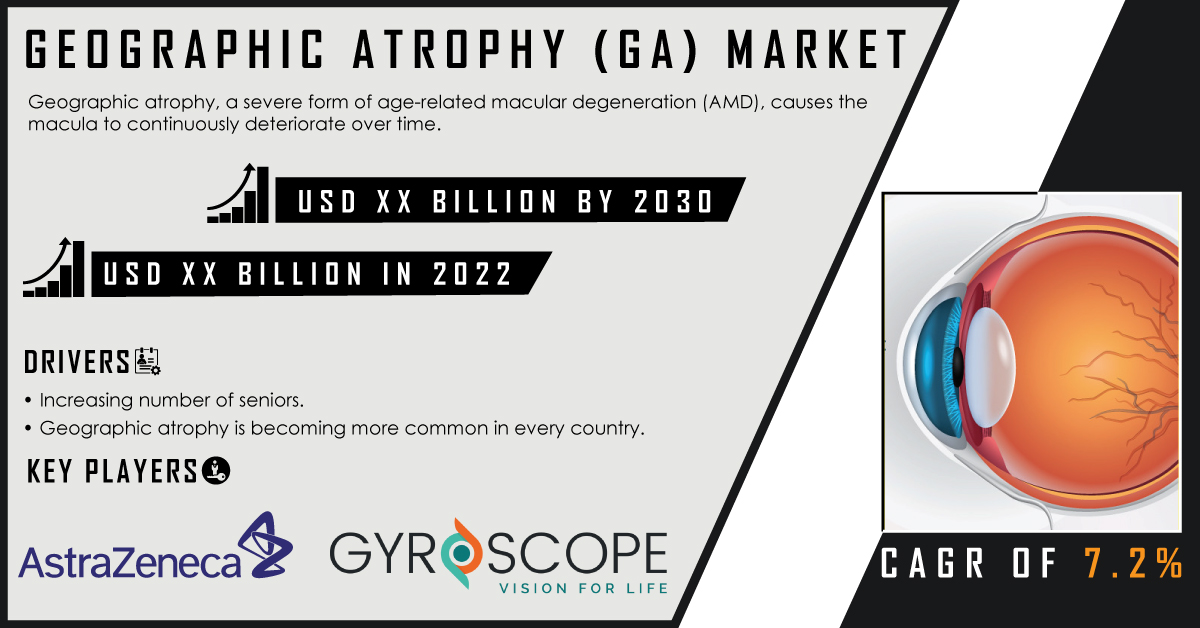 AUSTIN, TEXAS, UNITED STATES, May 21, 2024 /EINPresswire.com/ -- The global Geographic Atrophy (GA) Market, a progressive form of age-related macular degeneration (AMD), is projected to experience substantial growth, with a compound annual growth rate (CAGR) of 7.2% over the forecast period from 2023 to 2030. This market expansion is driven by the rising prevalence of GA, advancements in treatment options, and increasing awareness of the disease.Geographic atrophy is an advanced and severe form of AMD that leads to the gradual loss of vision due to the degeneration of the retinal pigment epithelium (RPE) and photoreceptors. It predominantly affects the elderly population, significantly impacting their quality of life and independence. The GA market encompasses a range of diagnostics and therapeutic solutions aimed at managing and mitigating the progression of the disease.