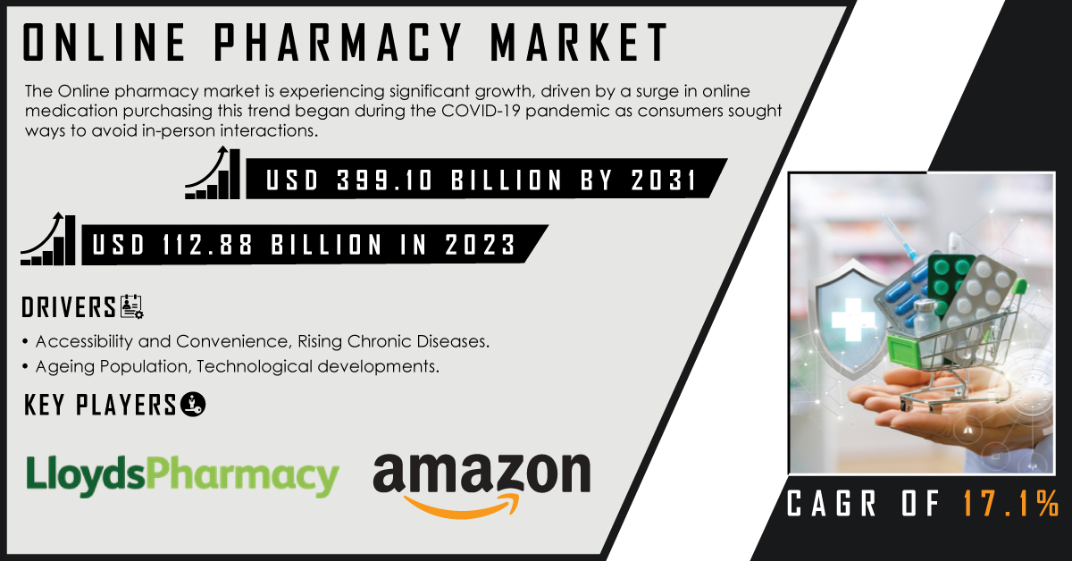 AUSTIN, TEXAS, UNITED STATES, May 21, 2024 /EINPresswire.com/ -- The global Online Pharmacy Market Size, valued at USD 112.88 billion in 2023, is projected to witness remarkable growth, reaching USD 399.10 billion by 2031. This expansion, at a compound annual growth rate (CAGR) of 17.1% from 2024 to 2031, is fueled by the rapid expansion of e-commerce, growing consumer preference for convenience, and advancements in digital healthcare infrastructure.Online pharmacies, which provide a platform for purchasing medications and healthcare products via the internet, offer a range of services including prescription drugs, over-the-counter medications, health supplements, and personal care products. The increasing reliance on digital health solutions and the ease of access to essential healthcare products are key factors driving the market’s growth.