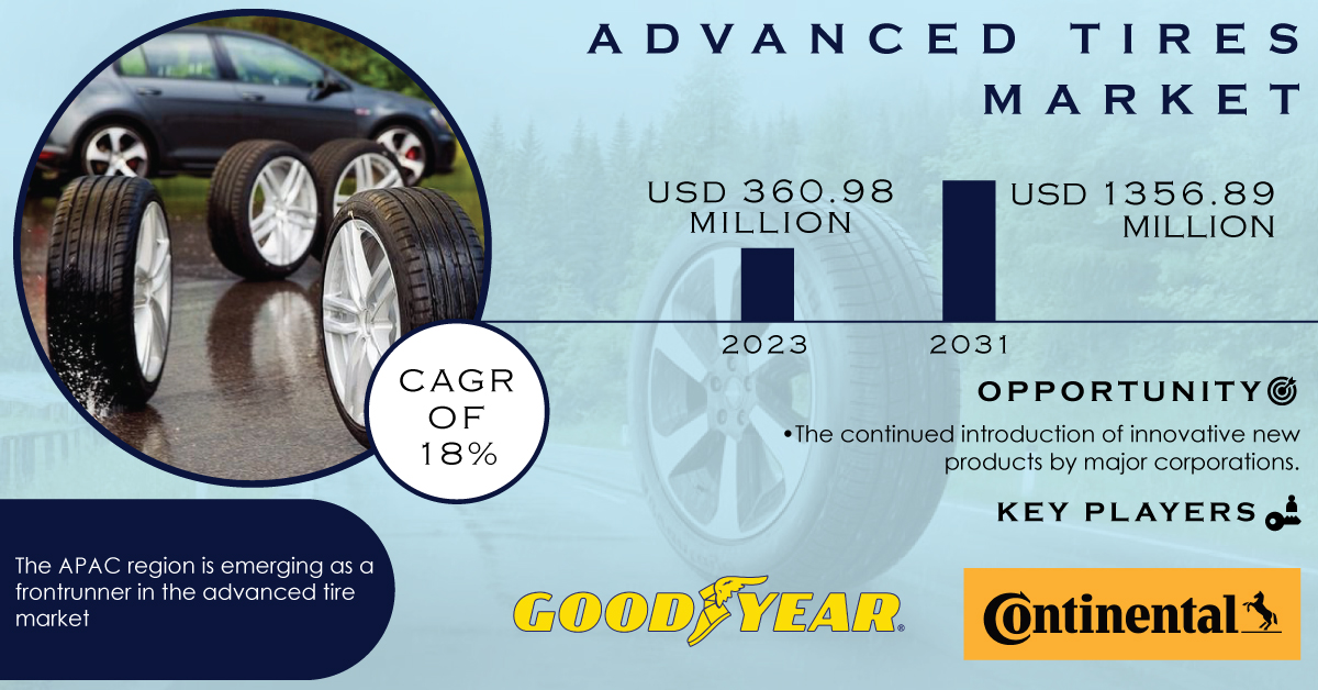 AUSTIN, TEXAS, UNITED STATES, May 21, 2024 /EINPresswire.com/ -- The advanced tires market is projected to witness significant growth in the coming years, driven by a surge in consumer preference for safety and performance features in vehicles. Advanced tires offer superior traction, handling, and braking capabilities on diverse terrains, catering to this growing demand.The Expansion Of The Advanced Tires Market Is Fueled By Several Factors, Including