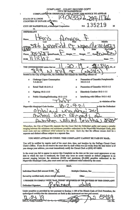 On December 4, 2019, Naperville Police Officer Juan Leon charged Ms. Harris with theft under a Naperville ordinance, alleging she stole another student's Air Pods. Despite knowing there was no evidence of theft, the City of Naperville persisted in pursuing unsubstantiated charges against Ms. Harris, and insisted that she pay a fine for a municipal crime she did not commit.