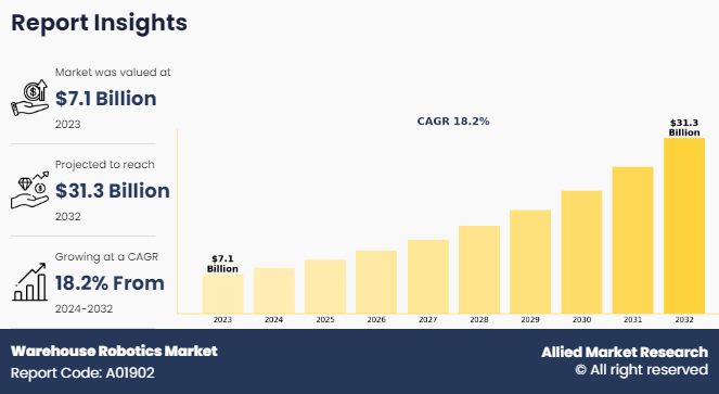 According to a new report published by Allied Market Research, titled, The warehouse robotics market size is $7,069.1 Million in 2023, and is estimated to reach $31,343.7 Million by 2032, growing at a CAGR of 18.2% from 2024 to 2032.