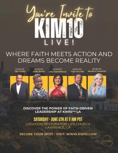 The event aims to inspire and equip participants to pursue their God-given dreams, achieve excellence in their endeavors, and make a positive impact on their communities and beyond. KIM10™ Live! is delighted to share these principles and values with the LA community and is thankful to Restoration Life Church for sharing their home.