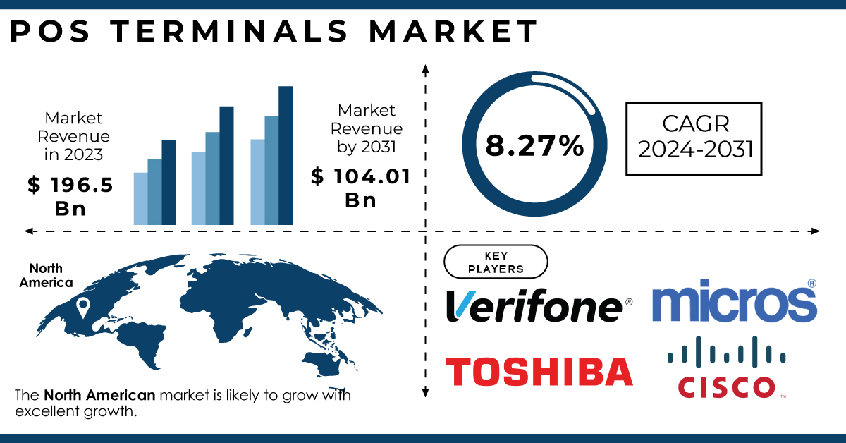 AUSTIN, TEXAS, UNITED STATES, May 23, 2024 /EINPresswire.com/ -- POS Terminals Market SizeAn SNS Insider report projects the POS Terminals Market was USD 104.01 Billion in 2023 and is anticipated to reach USD 196.5 Billion by 2031 and grow at a CAGR of 8.27% over the forecast period from 2024 to 2031. This exponential growth is a testament to the increasing ubiquity of POS terminals in everyday transactions.