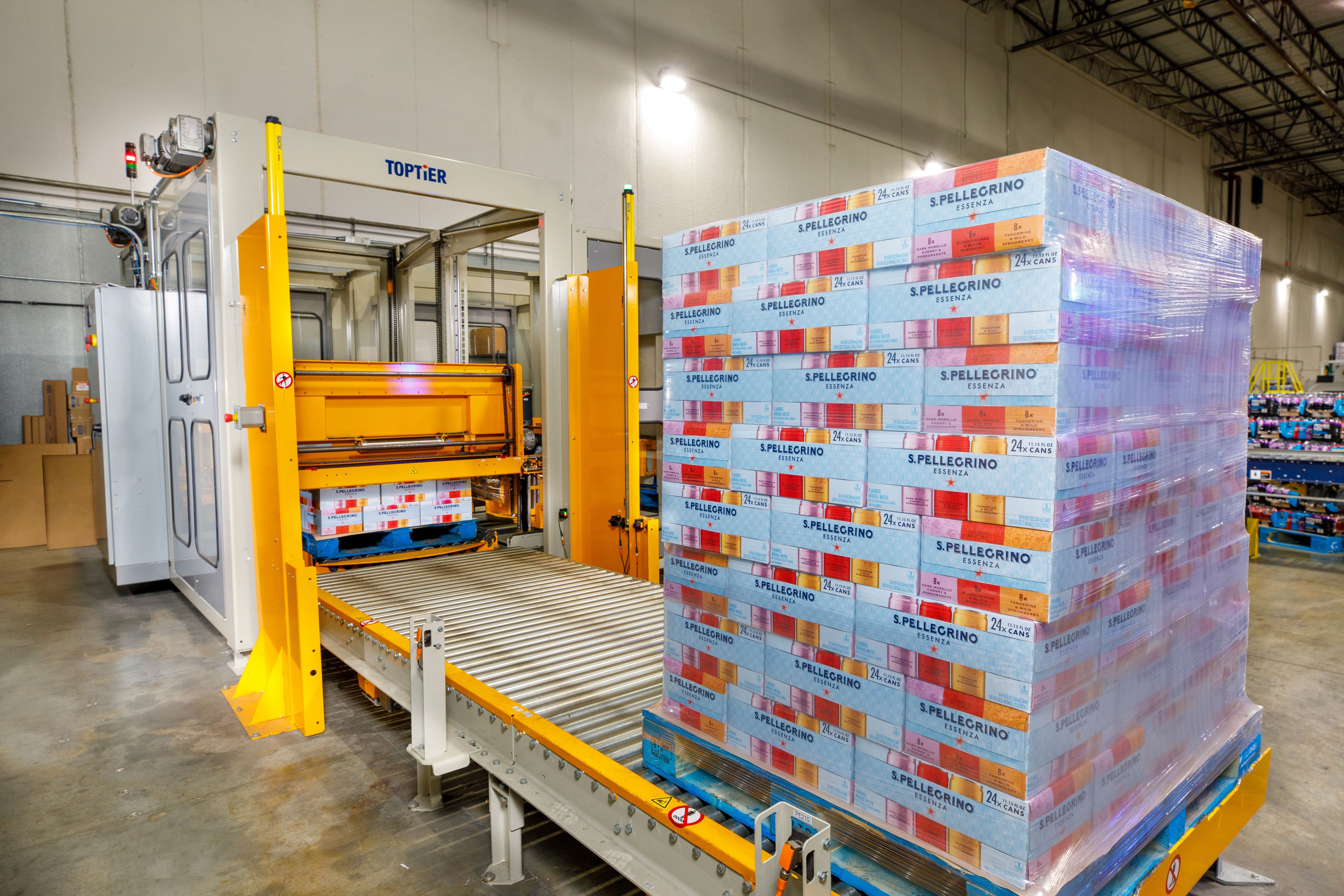 The sealed carton-packs then are conveyed to a computer-controlled mechanical palletizer, which automatically builds precise loads of variety-packed case beverages on pallets, securely shrink-wraps the pallet, and stages them for loading on to trucks and delivery to retailers throughout the Northeast U.S.