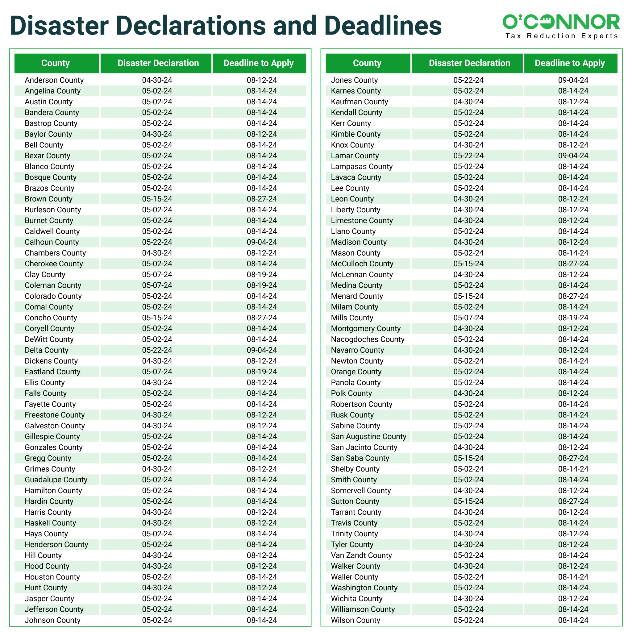 O’Connor has compiled a list of the 98 counties currently included in Governor Greg Abbott’s disaster declaration, along with the dates for when each county was added to the list, and the deadline for property owners in that county to apply for exemption.