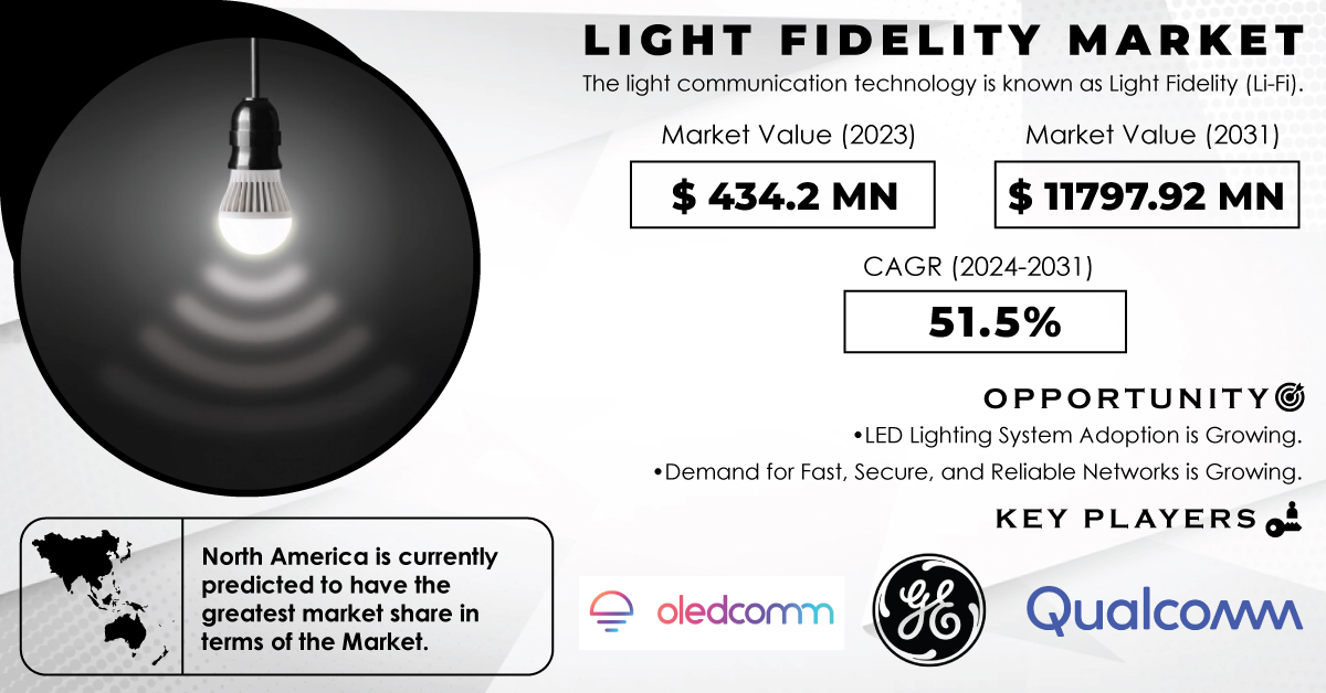 AUSTIN, TEXAS, UNITED STATES, May 24, 2024 /EINPresswire.com/ -- Market Scope and OverviewThe SNS Insider report forecasts that the Light Fidelity Technology Market will surge from USD 434.2 Million in 2023 to a staggering USD 11,797.92 Million by 2031, reflecting a robust CAGR of 51.1% over the forecast period 2024-2031.