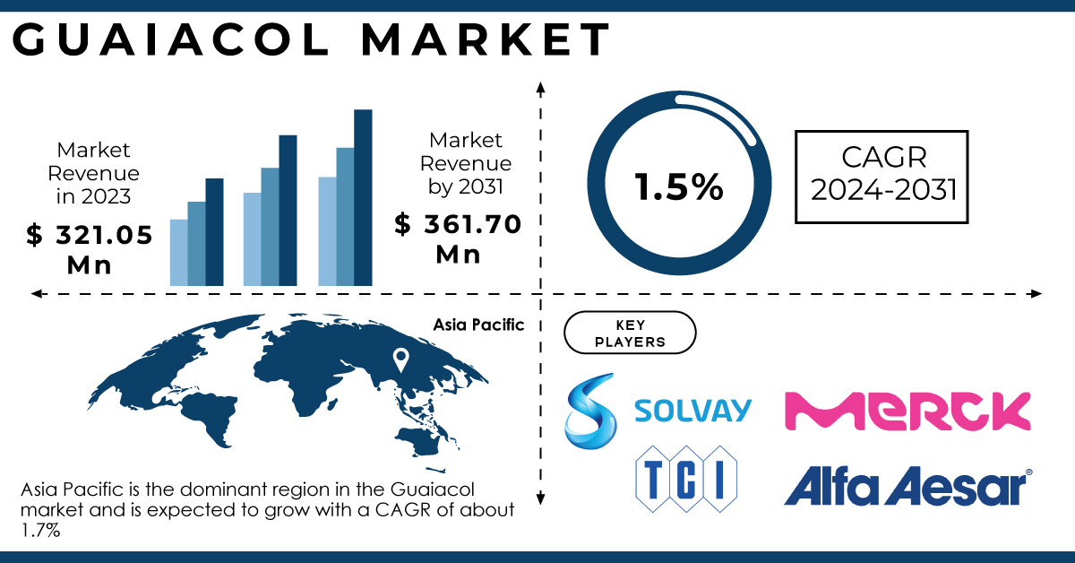 TEXES, AUSTIN, UNITED STATES, May 24, 2024 /EINPresswire.com/ -- According to the SNS Insider report, the guaiacol market was valued at USD 321.05 million in 2023 and is projected to reach USD 361.70 million by 2031, exhibiting a CAGR of 1.5% during the forecast period of 2024-2031.The pharmaceutical sector also plays a pivotal role, as the growing population fuels the demand for Guaiacol-based drugs like guaifenesin.
