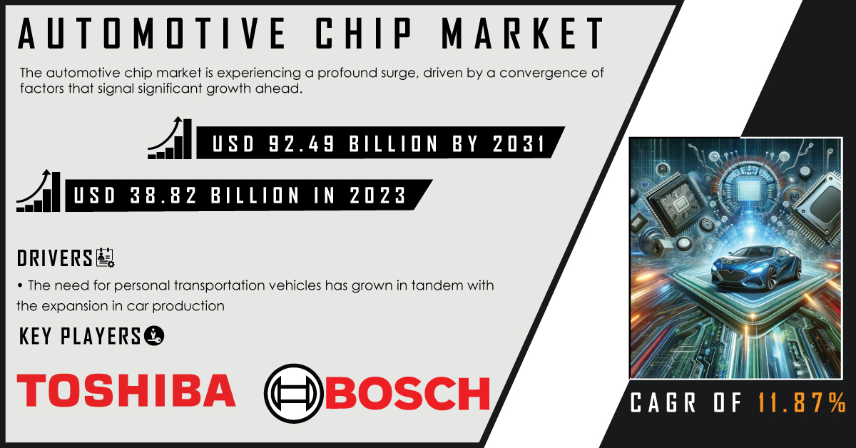 AUSTIN, TEXAS, UNITED STATES, May 24, 2024 /EINPresswire.com/ -- According to SNS Insider, The Automotive Chip Market Analysis, valued at USD 38.82 Billion in 2023, is poised for exponential growth, projected to reach USD 92.49 Billion by 2031. This remarkable expansion, with a compound annual growth rate (CAGR) of 11.87% from 2024 to 2031, is attributed to various catalysts driving innovation and demand in the automotive sector.Market Scope: