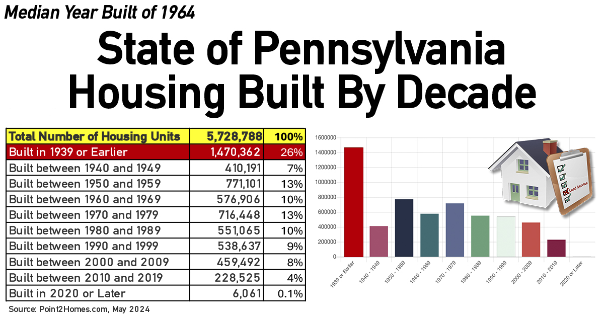 With over 5.7 million housing units and a median year built of 1964, over 25% or 1.5 million homes were built before 1939 in the State of Pennsylvania.