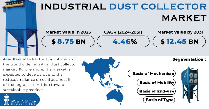 TEXES, AUSTIN, UNITED STATES, May 27, 2024 /EINPresswire.com/ -- The Industrial Dust Collector Market size was valued at USD 8.75 Bn in 2023 and is expected to reach USD 12.45 Bn by 2031 and grow at a CAGR of 4.46% over the forecast period 2024-2031.The global industrial dust collector market is set for substantial growth in the coming years, fueled by increasing environmental regulations, advancements in dust collection technology, and rising awareness of workplace safety and air quality. According to recent market analysis, the industry is expected to grow at a compound annual growth rate (CAGR) of 6.3% from 2023 to 2030.