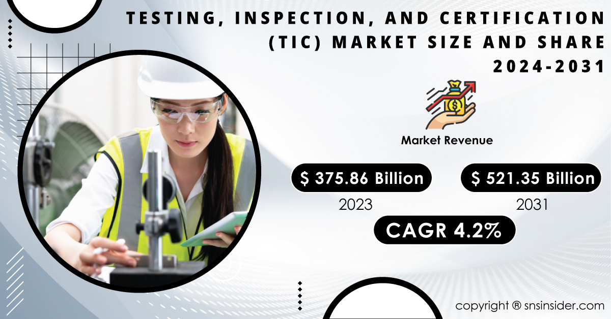 AUSTIN, TEXAS, UNITED STATES, May 27, 2024 /EINPresswire.com/ -- Market SizeThe SNS Insider report reveals that the Testing, Inspection, and Certification (TIC) Market was valued at USD 375.86 billion in 2023 and is projected to reach USD 521.35 billion by 2031, exhibiting a robust compound annual growth rate (CAGR) of 4.2% during the forecast period of 2024-2031.