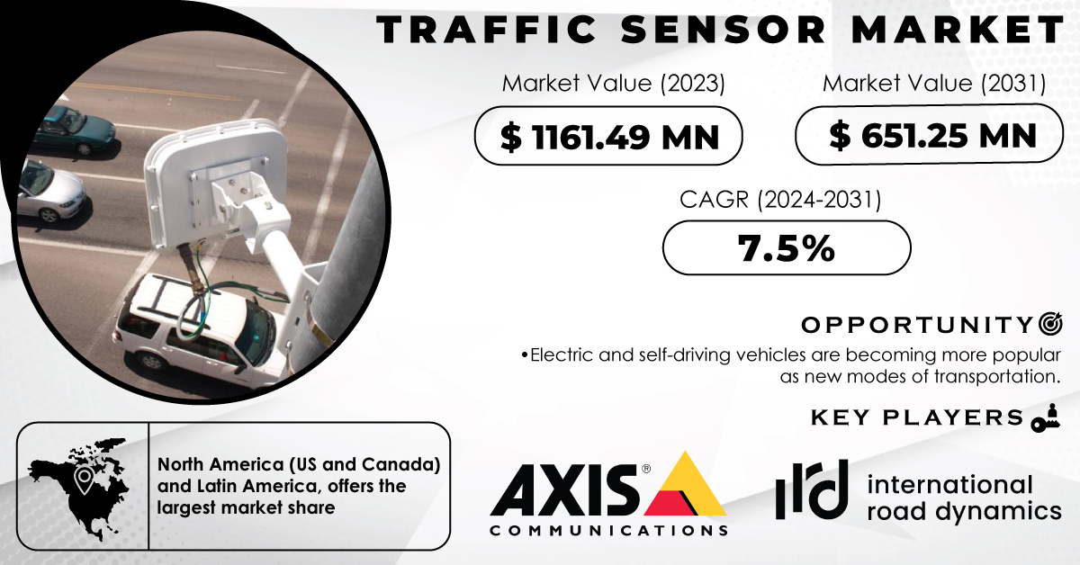 AUSTIN, TEXAS, UNITED STATES, May 29, 2024 /EINPresswire.com/ -- Traffic Sensor Market SizeAccording to a comprehensive report by SNS Insider, the global traffic sensor market is projected to reach a substantial value of USD 1161.49 million by 2031, a significant increase from its valuation of USD 651.25 million in 2023. This growth trajectory reflects a robust compound annual growth rate (CAGR) of 7.5% throughout the forecast period of 2024-2031.