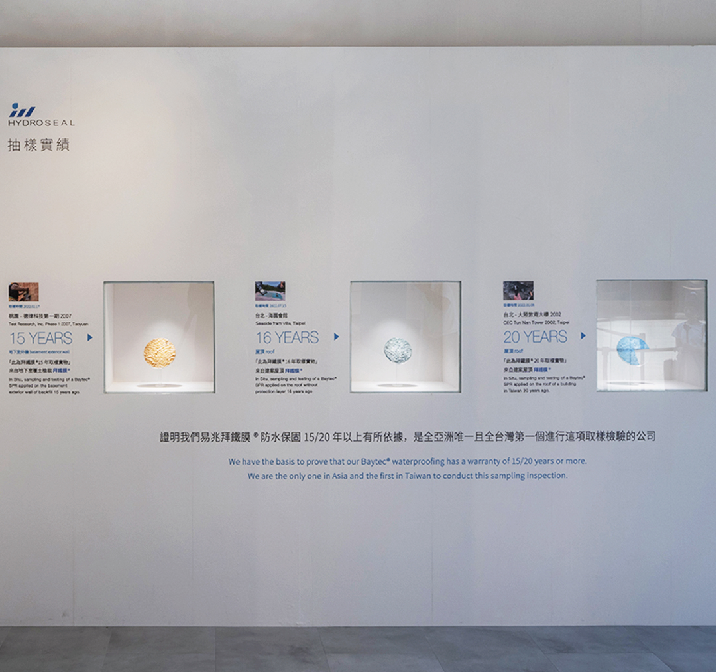 In 2024, Hydroseal hosted the "Taiwan Hydroseal Baytec®SPR 20-Year Sampling Witness Conference," attracting industry leaders and experts. During this event, third-party laboratories conducted thorough on-site testing and sampling, verifying that Baytec®SPR continues to deliver outstanding waterproofing performance, tensile strength, crack resistance, and concrete protection despite two decades of environmental challenges. These findings underscore Baytec®SPR's ability to exceed a lifespan of 30 years, with an anticipated durability of over 40 years.