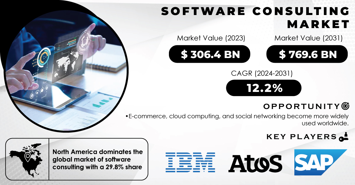 AUSTIN, TEXAS, UNITED STATES, May 30, 2024 /EINPresswire.com/ -- Market Scope and OverviewThe SNS Insider report indicates that the Software Consulting Market size was valued at USD 306.4 Billion in 2023, and is expected to reach USD 769.6 Billion by 2031 and grow at a CAGR of 12.2% over the forecast period 2024-2031.