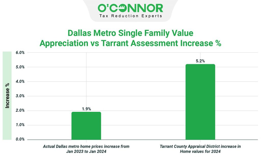 The Metro Tex Association of Realtors reported a mere 1.9% increase in property values in the Dallas Metro area from January 2023 to January 2024. Meanwhile, following the 2024 property tax reassessment in Tarrant County, the TAD reportedly raised home values by 5.2%