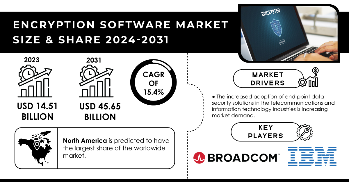 AUSTIN, TEXAS, UNITED STATES, May 31, 2024 /EINPresswire.com/ -- Market Scope and OverviewThe Encryption Software Market is experiencing significant growth due to the escalating need for data security in workplaces that embrace Bring-Your-Own-Device (BYOD) policies. A recent report by SNS Insider indicates that the market size was valued at USD 14.51 Billion in 2023 and is expected to reach USD 45.65 Billion by 2031, reflecting a robust CAGR of 15.4% over the forecast period 2024-2031.