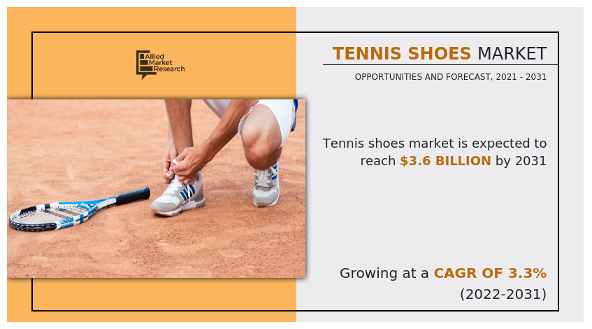 WILMINGTON, NEW CASTLE, DELAWARE 19801 USA, UNITED STATES, May 31, 2024 /EINPresswire.com/ -- According to a new report published by Allied Market Research, titled, “tennis shoes market by playing surface, user, and distribution channel: global opportunity analysis and industry forecast, 2021–2028,”. The report provides a detailed analysis of the top investment pockets, top winning strategies, drivers & opportunities, market size & estimations, competitive landscape, and changing market trends. 𝐓𝐡𝐞 𝐠𝐥𝐨𝐛𝐚𝐥 𝐭𝐞𝐧𝐧𝐢𝐬 𝐬𝐡𝐨𝐞𝐬 𝐦𝐚𝐫𝐤𝐞𝐭 𝐬𝐢𝐳𝐞 𝐰𝐚𝐬 𝐯𝐚𝐥𝐮𝐞𝐝 𝐚𝐭 $𝟐.𝟓 𝐛𝐢𝐥𝐥𝐢𝐨𝐧 𝐢𝐧 𝟐𝟎𝟐𝟏, 𝐚𝐧𝐝 𝐢𝐬 𝐩𝐫𝐨𝐣𝐞𝐜𝐭𝐞𝐝 𝐭𝐨 𝐫𝐞𝐚𝐜𝐡 $𝟑.𝟔 𝐛𝐢𝐥𝐥𝐢𝐨𝐧 𝐛𝐲 𝟐𝟎𝟑𝟏, 𝐠𝐫𝐨𝐰𝐢𝐧𝐠 𝐚𝐭 𝐚 𝐂𝐀𝐆𝐑 𝐨𝐟 𝟑.𝟑% 𝐟𝐫𝐨𝐦 𝟐𝟎𝟐𝟐 𝐭𝐨 𝟐𝟎𝟑𝟏.