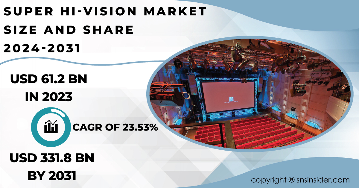 AUSTIN, TEXAS, UNITED STATES, June 4, 2024 /EINPresswire.com/ -- Super Hi-Vision Market SizeThe Super Hi-Vision market is growth is projected to reach USD 331.8 billion by 2031. This growth is driven by the Increasing consumer preference for high-resolution displays that deliver an immersive and lifelike viewing experience. The SNS Insider report highlights a market size of USD 61.2 billion in 2023, poised for a significant expansion at a CAGR of 23.53% over the forecast period. This growth is Driven by a confluence of factors, including advancements in display technology, the proliferation of large-screen, high-resolution TVs, and a growing appetite for superior content creation capabilities.