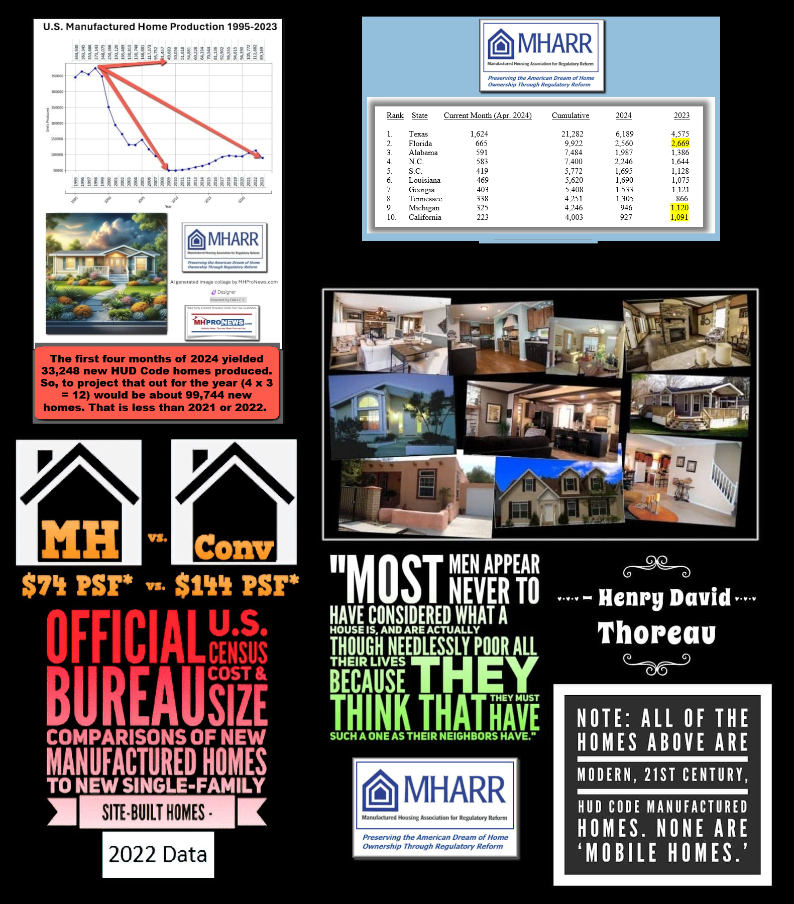 Manufactured Housing Association for Regulatory Reform Manufactured Home Infographic updated for April 2024 Data. Note click the image and follow the prompts to see this in a larger size.