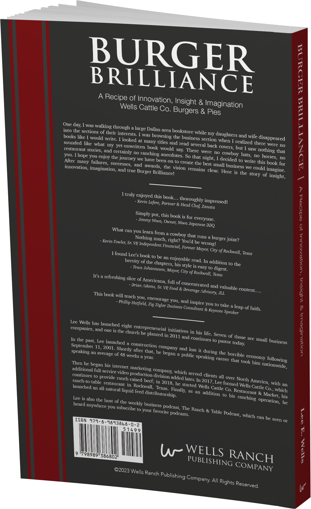 Lee Wells’ book, Burger Brilliance, is available in paperback, hardcover, and e-book formats. His style of writing is easy to follow with a concise subchapter layout that is perfect for busy people with interruptions. The book is available at Lee’s online store, Barnes and Noble, and Amazon.
