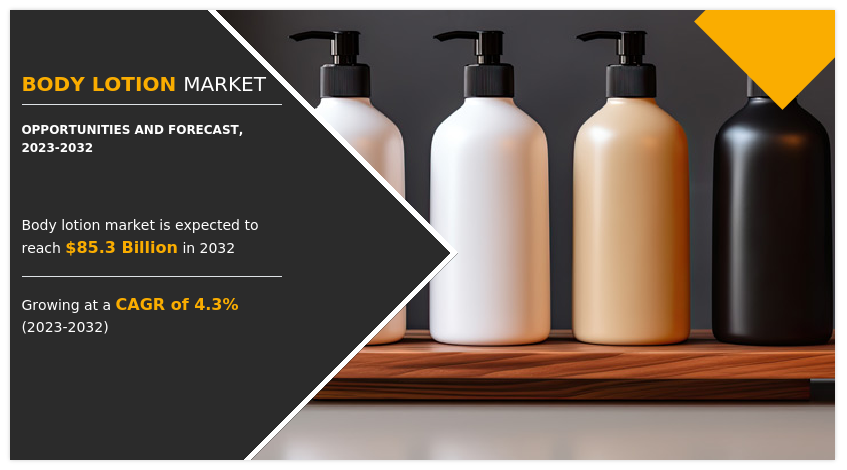 WILMINGTON, NEW CASTLE, DELAWARE 19801 USA, UNITED STATES, June 8, 2024 /EINPresswire.com/ -- According to a new report published by Allied Market Research, titled, “Body Lotion Market," The body lotion market was valued at $56.4 billion in 2022, and is estimated to reach $85.3 billion by 2032, growing at a CAGR of 4.3% from 2023 to 2032. The report provides a detailed analysis of the top investment pockets, top winning strategies, drivers & opportunities, market size & estimations, competitive landscape, and changing market trends.