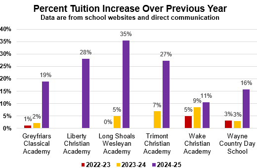 For example, in 2021-22 the average tuition at Wayne Country Day School in Goldsboro ranged from $9,700 in kindergarten to $11,300 in grade 12. Across all grades, the average tuition was $11,038. For the next two years, tuition went up $350 each year in every grade (3%). But tuition for the 2024-25 school year went up an average of $1,838 (16%) and now ranges from $12,120 to $14,005 per student.
