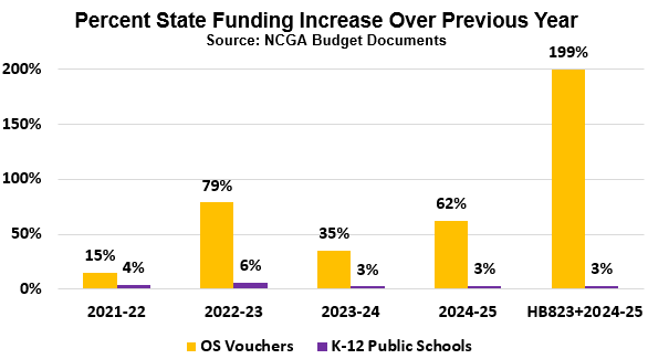 The North Carolina Senate acted quickly in May to make sure new applicants were covered by passing House Bill 823 (along party lines) to add $248 million for 2024-25 and $215 million for 2025-26. This $563 million increase is on top of what’s already in the budget for vouchers. If these allocations make it through the current budget negotiations with the House, vouchers will see a 199% increase over 2023-24 funding. In comparison, as shown in the second chart, the K-12 public school budget increase currently stands at just 3%.