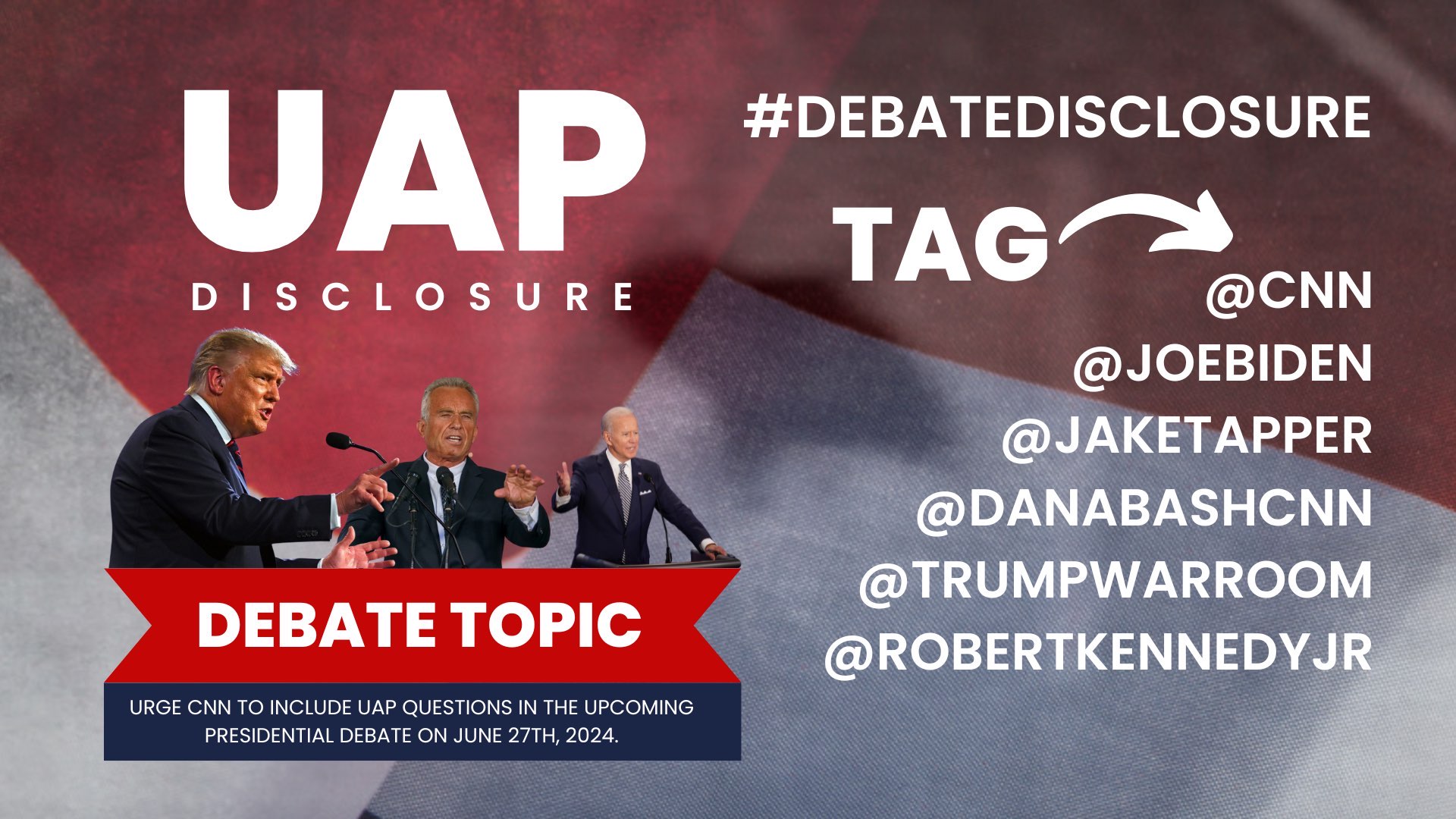 How the public can contribute to NPI’s call to action: On social media, call on CNN and its debate moderators to include a question about UAP, use hashtag #DebateDisclosure, and tag CNN, Jake Tapper, Dana Bash, Joe Biden, Robert F. Kennedy, Jr., Donald J. Trump, and the New Paradigm Institute.