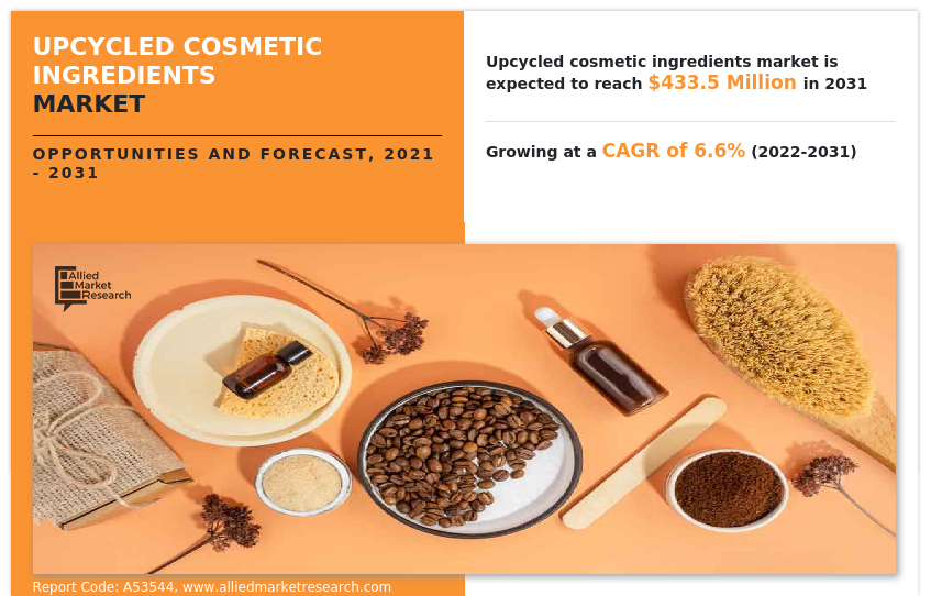 DELAWARE, WILMINGTON, UNITED STATES, June 12, 2024 /EINPresswire.com/ -- According to a new report published by Allied Market Research, titled, "Upcycled Cosmetic Ingredients Market," The upcycled cosmetic ingredients market size was valued at $231.48 million in 2021, and is estimated to reach $433.5 million by 2031, growing at a CAGR of 6.6% from 2022 to 2031. The report provides a detailed analysis of the top investment pockets, top winning strategies, drivers & opportunities, market size & estimations, competitive landscape, and changing market trends.