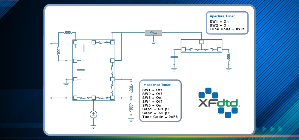 The release also includes subcircuit analysis in the schematic editor and the ability to retrieve tune codes based on desired switch states. As switch states are manipulated, XFdtd updates the corresponding tune code. Alternatively, a known tune code may be entered and the software will adjust the switch states accordingly for that particular tune code. This autofill functionality eliminates the need to transcribe data from external tables, thereby removing a point of error when determining how a particular state corresponds to a given value.