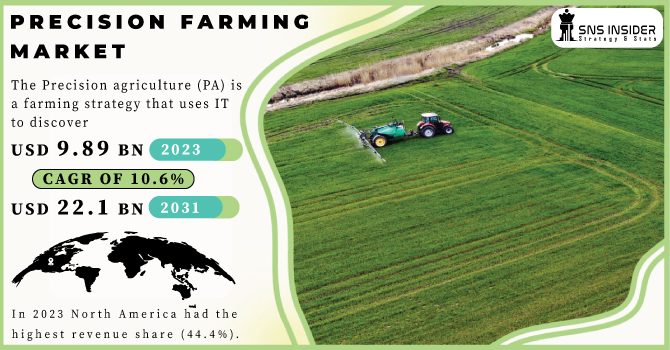 AUSTIN, TEXAS, UNITED STATES, June 14, 2024 /EINPresswire.com/ -- The global precision farming market is poised for significant growth, reaching an estimated value of USD 22.1 billion by 2031. This growth is attributed to the integration of precision farming technologies with existing farm machinery. This integration empowers farmers to effortlessly leverage Advanced sensors, GPS, and data analytics in their tractors, drones, and harvesters, enabling data-driven decision-making for optimized crop yields and resource management.The SNS Insider report highlights the market's promising trajectory, indicating a valuation of USD 9.89 billion in 2023 and a projected CAGR of 10.6% through the forecast period. This growth is Driven by a factor, The seamless integration of precision farming technologies with existing farm equipment is a key driver. This allows farmers to leverage sensors, GPS, and data analytics seamlessly, gathering real-time data on soil conditions, crop health, and weather patterns. This data empowers them to optimize resource allocation, adjust irrigation and fertilization schedules, and implement precision techniques for enhanced yields and operational efficiency. The rise of digital agriculture platforms and farm management software solutions is revolutionizing precision farming. These platforms offer farmers user-friendly interfaces to integrate and analyse data from various sources, enabling informed decisions based on real-time insights. This not only optimizes resource allocation but also promotes sustainable practices by minimizing wastage and environmental impact.