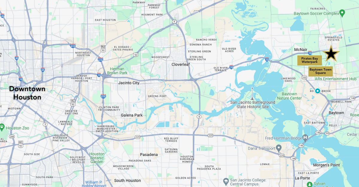 Cheerful Creek Court is located on I-10, which has roughly 86,000 commuters daily and is strategically located near major employers such as ExxonMobil, Chevron Phillips, GE Energy, Port Houston, Houston Methodist, and more. Additionally, the new site is located less than 2 miles from the soon-to-be developed San Jacinto Market, set to bring a vibrant mixed-use development with 1.1 million square feet of retail space, room for 20 restaurants, and plans for a sports and event center. Residents will enjoy access to a myriad of nearby conveniences and attractions. From shopping outlets to culinary delights and recreational activities like biking, hiking, boating, and fishing. Notable landmarks within reach include the upcoming San Jacinto Market, Chambers Town Center, Baytown Town Square, San Jacinto Historical Park, Johnson Space Center, and Downtown Houston, all within a convenient 30-minute drive.