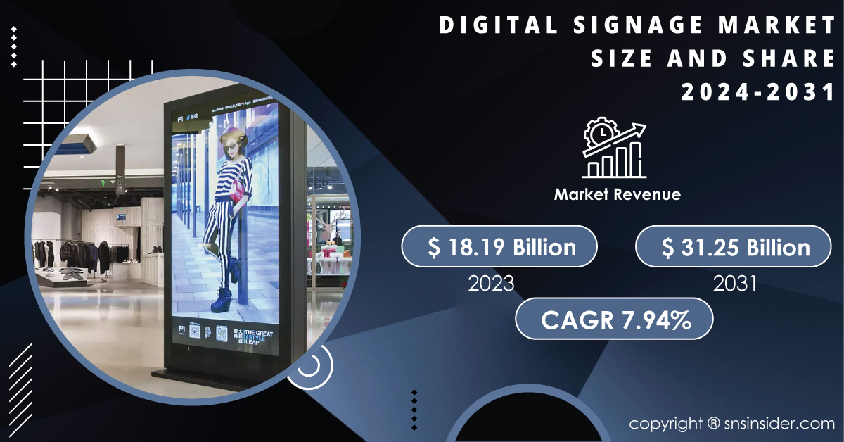 AUSTIN, TEXAS, UNITED STATES, June 17, 2024 /EINPresswire.com/ -- Market Scope and OverviewThe SNS Insider report estimates the Digital Signage Market size at USD 18.19 billion in 2023, with a projected CAGR of 7.94% to reach USD 31.25 billion by 2031. The market growth is accounted by the rising demand for the digitized promotion of products as well as services to grab the attention of the target audience effectively. Moreover, the demand for 4K digitized sign displays with embedded software along with the media player is increasing as it delivers customers the cost effective Ultra HD digital signage solution, that is also witnessed to boost the demand. The transformation of innovative products including leak detector systems, home monitoring systems, and so on, along with complex complicated monetary products including forex cards which require informative and advertisement content are some of the key factors that are estimated to boost the product demand.
