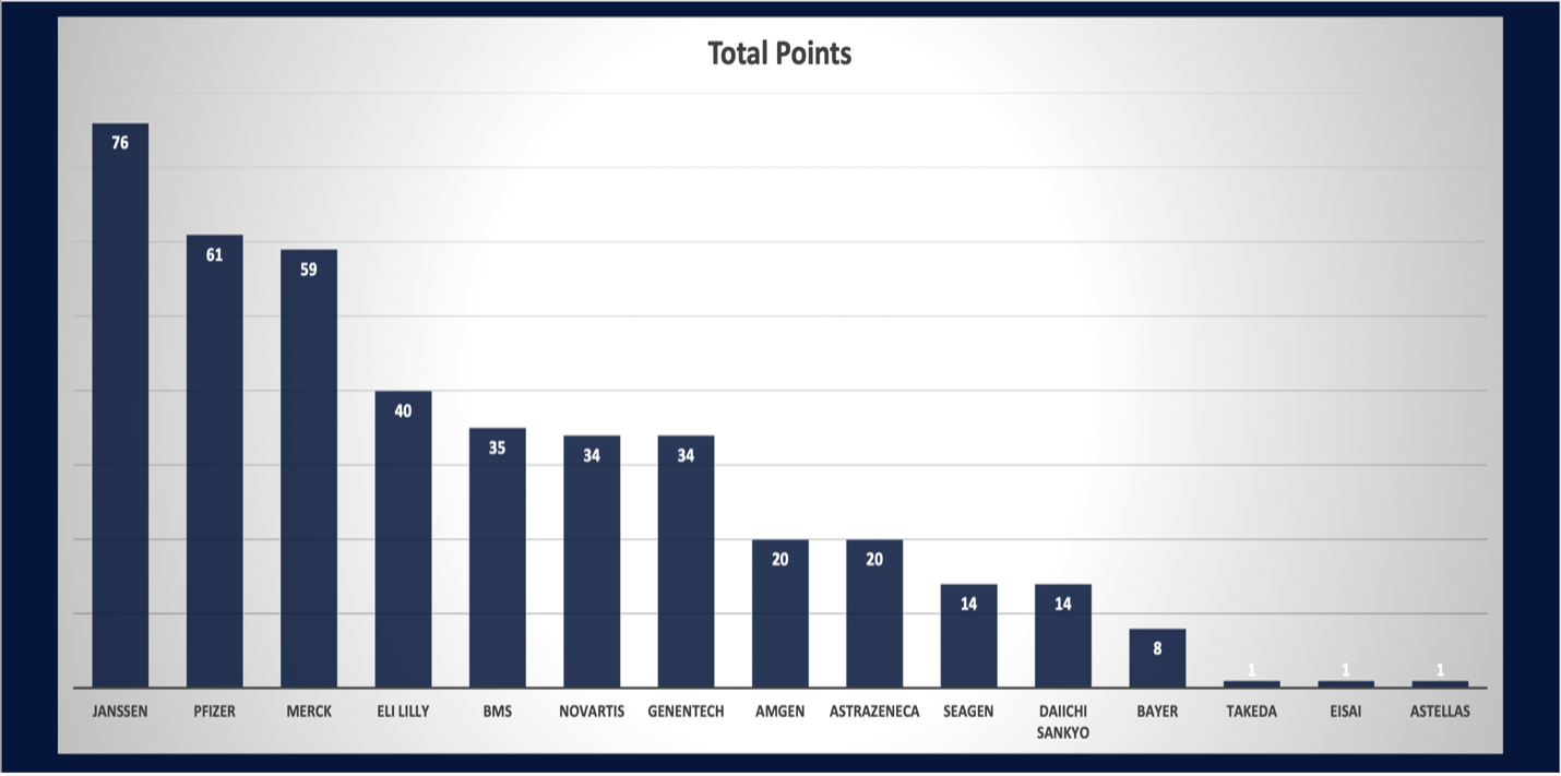 • Janssen leads with 76 points, demonstrating its significant influence in oncology research and patient care.