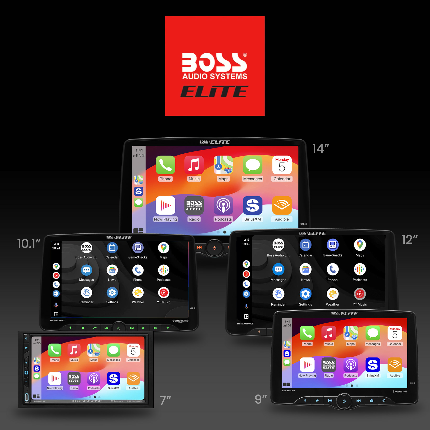 The new BOSS Elite Headunits feature an updated touchscreen design, intuitive tactile buttons, and dynamic ambient lighting, all crafted to enhance the driving experience. Built-in Digital Signal Processor (DSP) capabilities allow users to personalize their audio settings effortlessly, ensuring a customized sound experience. Notably, the oversized screen options, available in 12" and 14" sizes, set a new industry benchmark. The Headunits are also available in 9", 10.1" and 7" Double DIN variations. Compatibility with Apple CarPlay® and Android Auto™ ensures seamless connectivity with smartphones and streaming services, while built-in SiriusXM capability allows direct access to satellite radio without needing to connect your phone, although a separate tuner is required for this function.