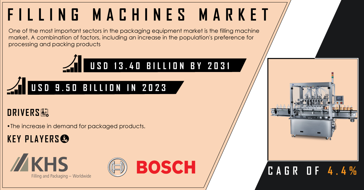 AUSTIN, TEXAS, USA, June 20, 2024 /EINPresswire.com/ -- The Filling Machines Industry was valued at USD 9.50 billion in 2023 and is projected to reach a value of USD 13.40 billion by 2031, reflecting a CAGR of 4.4%, according to the SNS Insider report.The Filling Machines Market is booming with growth due to its ability to address key industry needs. These machines offer several advantages, they boost productivity by reducing labor costs and increasing output, ensure consistent product quality through precise filling, and provide flexibility through modular designs that adapt to various production demands. This versatility caters to the growing trend of customized packaging and caters to a wide range of industries, including food & beverage, cosmetics, pharmaceuticals and chemicals. Furthermore, rising disposable incomes in developing regions like South Asia and East Asia Pacific fuels the demand for packaged goods further propelling the market forward. Additionally, stricter government regulations in food & beverage and other sectors are pushing manufacturers towards adopting these machines to meet hygiene and quality standards.