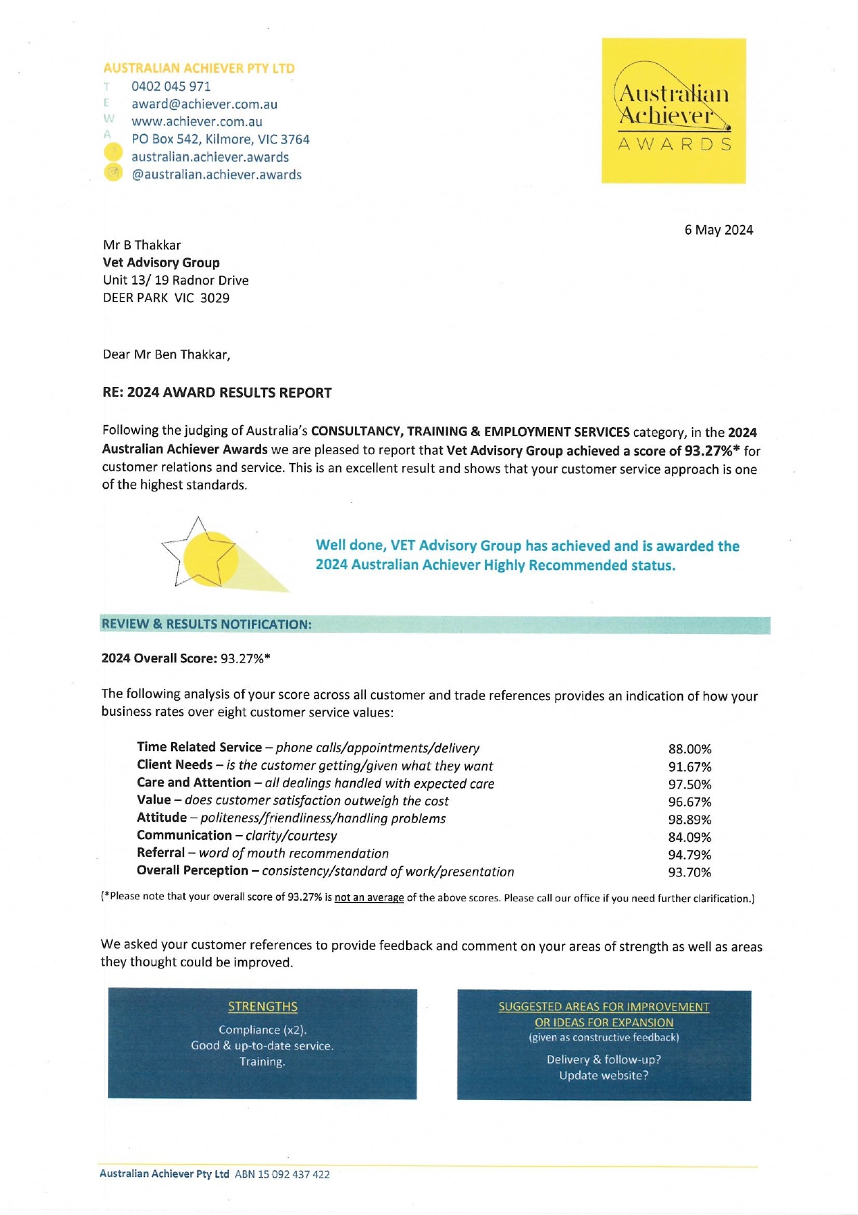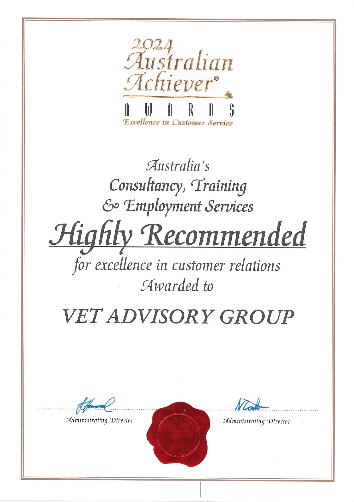 DEER PARK, VIC, AUSTRALIA, June 22, 2024 /EINPresswire.com/ -- (Date) – Melbourne, Australia – The VET Advisory Group is pleased to share that, in the 2024 Australian Achiever Awards, they achieved an outstanding customer satisfaction score of 93.27%. The company's dedication to providing excellent consulting, training, and employment services is demonstrated by this distinction.The Australian Achiever Awards are well known for recognising companies that provide exceptional customer service. The VET Advisory Group's rating was established after a thorough assessment procedure. Time-related service, attending to client needs, value, attitude, communication, overall perception, and referral were among the factors used to score customer service.