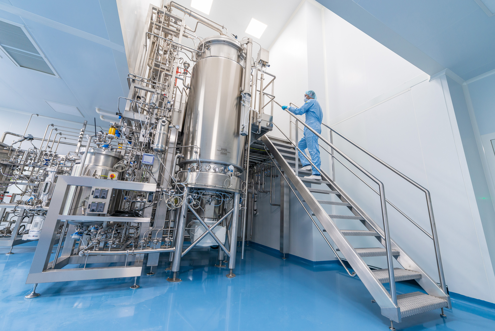 Full view of the 2200 L fermenter in a GMP manufacturing area to produce plasmidDNA biopharmaceuticals