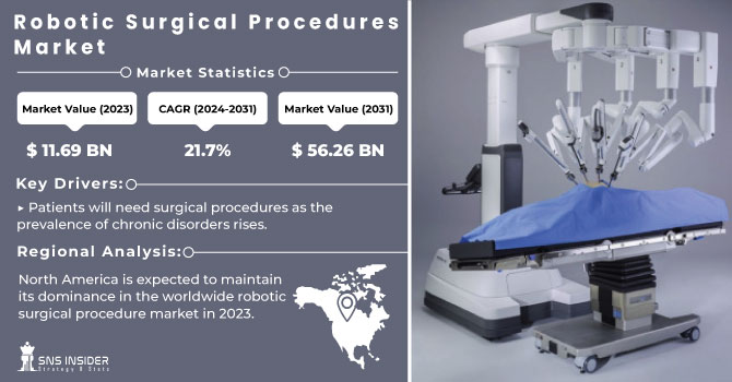 AUSTIN, TEXAS, UNITED STATES, June 21, 2024 /EINPresswire.com/ -- The SNS Insider report estimates the Robotic Surgical Procedures Market size at USD 11.69 billion in 2023, with a projected CAGR of 21.7% to reach USD 56.26 billion by 2031.The global surgery in chronic diseases like cancer, heart disease, and musculoskeletal problems is creating a growing need for surgical procedures. A rapidly aging population with a higher predisposition for chronic diseases, and rise in sedentary lifestyles. As a result, the demand for robotic surgery is increasing, with its minimally invasive approach becoming increasingly sought after, even in emergency situations. This shift towards robotic-assisted procedures is likely to continue due to several reasons such as, the number of people requiring surgery due to chronic diseases is creating a larger pool of potential patients who could benefit from robotic-assisted procedures. Robotic surgical systems are becoming more user-friendly. Insurance companies and government healthcare programs are recognizing the benefits of robotic surgery, leading to more favorable regulatory policies for these procedures. This makes robotic surgery more accessible to a wider range of patients. Established players in the robotic surgery market, like Intuitive Surgical and Stryker, are constantly innovating and expanding their product lines. This with the entry of new players into the market, is accelerating advancements in robotic surgical technology and driving down costs.