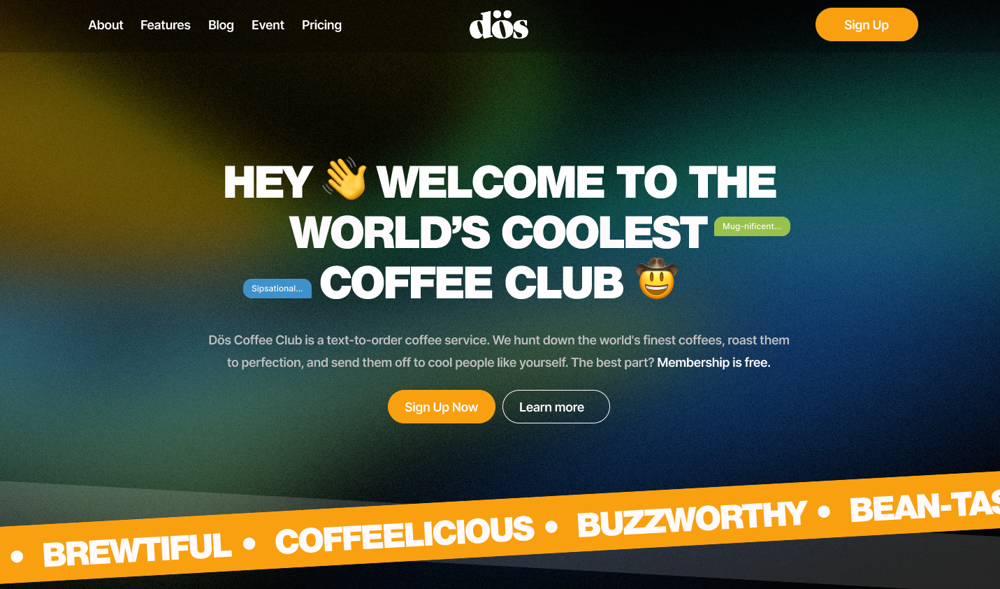 Dös Coffee Club is a luxury text-to-buy coffee service offering subscribers access to the world's most exotic and finest coffees. Founded by Evan Wickersham, the club provides a unique, frictionless way for coffee enthusiasts to explore and purchase rare, high-end coffees.